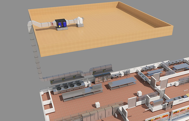 5.系统工程设计阶段:在厨房内排烟通风系统与空调系统、消防系统、周边环境,在流通气流和空间结构上存在紧密关系。排烟通风系统设计时,在保证排烟效果的前提下,新风量计算必须考虑与空调系统、消防系统、周边环境的流通及风量关系。需要根据厨房整体环境、各种工作间洁净度、气流流程、节能高效等要求,进行排烟通风系统风量的计算,并要结合技术环境完成系统所有配置设计。为保证系统设计及施工科学高效、节能环保、降低费用就需要实施系统工程设计。