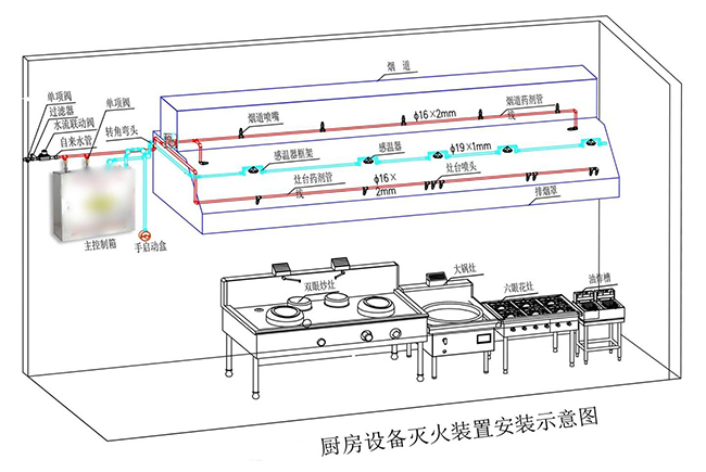 根据厨房实际情况设计灭火系统和预订探测信号参数,防止出现误启动或迟后启动。厨房的温度、烟感探测与一般房间不同,厨房各部位也不相同,要结合实际设置点位,报警探测敏感度要设置在合理的范围。灶前温度,特别是爆锅瞬间、锅离灶口时火苗与喷射热气温度比较高,到达排烟罩时,可达到60~100°C,若按一般房间的预订探测信号参数,就会发生误报信号。灭火喷洒的点位也要结合厨房实际情况,把喷洒喷嘴对准容易发生火灾的位置,并且确保流量与压力,有效地消灭失火源。